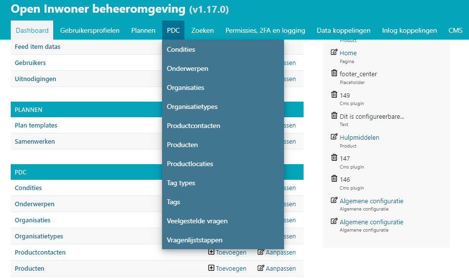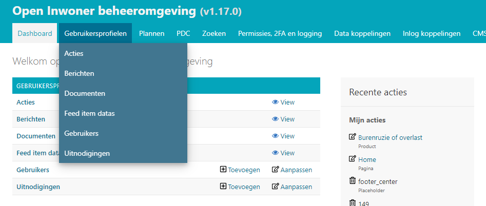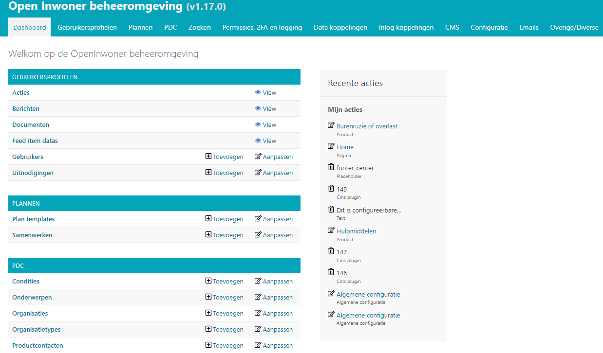 Wanneer u bent ingelogd komt u terecht op de dashboardpagina. Dit is de overzichtspagina waar u uw recente acties kunt zien en waar u via de kortste route voor sommige onderdelen direct bepaalde wijzigingen kunt uitvoeren en informatie snel kunt raadplegen. In het dashboard vindt u (korte routes naar) de gebruikersprofielen, de plannen, de PDC (Producten en Diensten Catalogus), zoeken, de permissies, two factor authentication en logging, Datakoppelingen, Inlog koppelingen, het CMS, de configuratie, e-mails en overige/diverse.