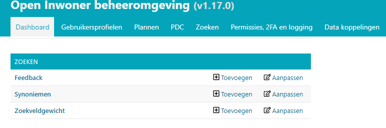Via het dashboard kunt u direct doorklikken naar de onderdelen die bij de zoekfunctie horen, namelijk feedback op de zoekfunctie, synoniemen voor zoekwoorden en zoekveldgewicht. U kunt deze onderdelen direct wijzigen en extra items toevoegen. Toevoegen doet u door te klikken op de knop [ + toevoegen]. Wijzigen doet u door te klikken op de knop [aanpassen].