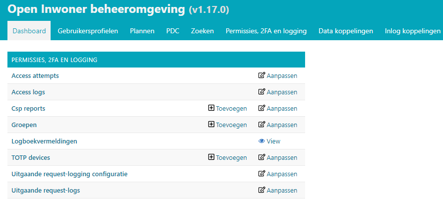 Op het dashboard vindt u het overzicht van de onderdelen van Permissies, 2FA (two factor authentication) en logging. Het gaat hier om onderdelen die te maken hebben met de gebruikersrollen en permissies, de tweestaps authenticatie en zaken die gemonitord worden. Via het dashboard kunt u de onderliggende onderdelen direct wijzigen en aan sommige onderdelen kunt u extra items toevoegen. Toevoegen doet u door te klikken op de knop met [ + toevoegen]. Wijzigen doet u door te klikken op de knop [aanpassen].