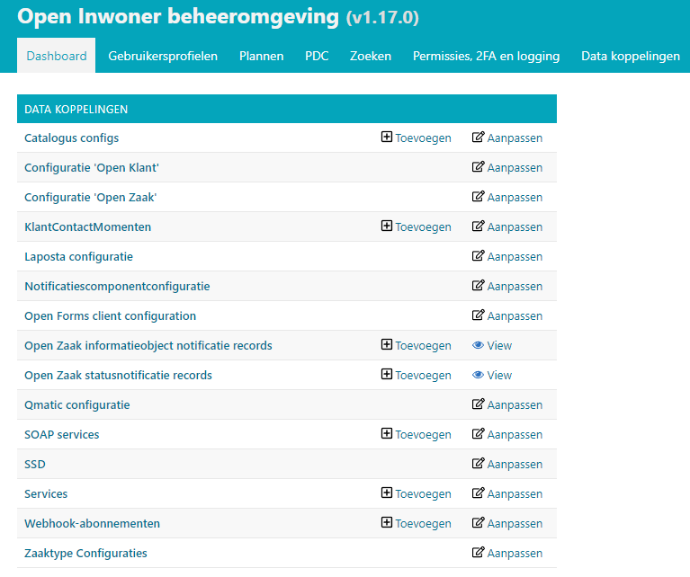 Op het dashboard vindt u het overzicht van de onderdelen datakoppelingen. Het gaat hier om onderdelen die te maken hebben met de koppeling van externe systemen aan het Open Inwoner Platform. Sommige onderdelen kunt u direct wijzigen en aan sommige onderdelen kunt u extra items toevoegen. Toevoegen doet u door te klikken op de knop met [ + toevoegen]. Wijzigen doet u door te klikken op de knop [aanpassen].