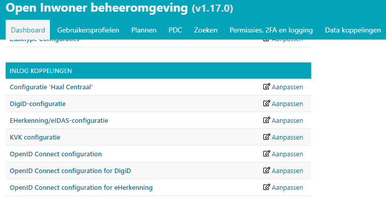 Op het dashboard vindt u het overzicht van de onderdelen inlog koppelingen. Het gaat hier om onderdelen die te maken hebben met de koppeling en configuratie van (soms verplichte) inlogwijzes aan het Open Inwoner Platform. Denk aan DigiD, eHerkenning en KVK. U kunt onderdelen kunt u direct wijzigen door te klikken op de knop [aanpassen].