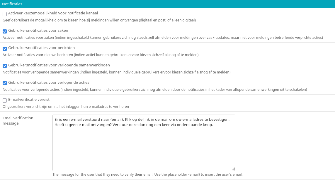 Het e-mailverificatiebericht voor nieuwe gebruikers is configureerbaar. Als e-mailverificatie vereist is, mag het bericht niet leeg zijn.