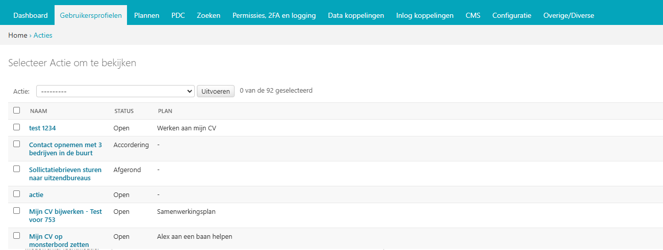 Onder acties vindt u alle acties die gebruikers aan de voorkant van Open Inwoner (onder Mijn Profiel) hebben aangemaakt. U kunt de acties eenvoudig filteren op gebruiker. U ziet dan enkel de acties die bij een bepaalde gebruiker horen. Dit onderdeel is enkel in te zien (read-only).