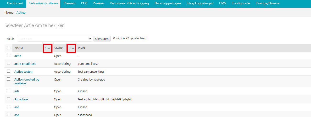 U kunt het actieoverzicht sorteren op naam, creatiedatum en gebruiker. Dit doet u door op de gewenstekolomnaam te klikken. U kunt oplopend of aflopend sorteren op één of meerdere kolommen. Wanneer u alleen wilt sorteren op Naam klikt u enkel op deze kolom. Om te wisselen tussen oplopend en aflopend klikt u op het icoontje van het driehoekje dat naar boven of naar beneden wijst.