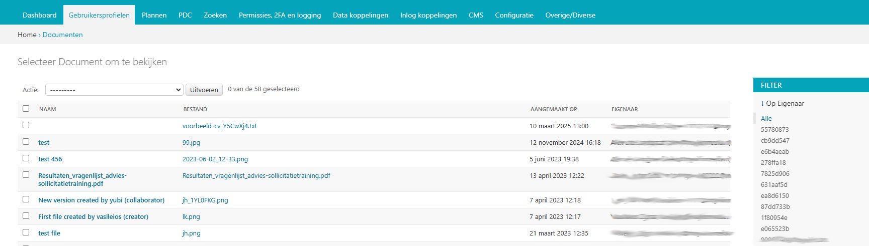 Onder documenten vindt u alle documenten die gebruikers aan de voorkant van Open Inwoner (onder Mijn Profiel) hebben aangemaakt. Dit onderdeel is read-only: er kunnen geen wijzigingen worden aangebracht. U kunt documenten eenvoudig filteren op gebruiker. U ziet dan enkel de documenten die toegevoegd zijn door een bepaalde gebruiker.