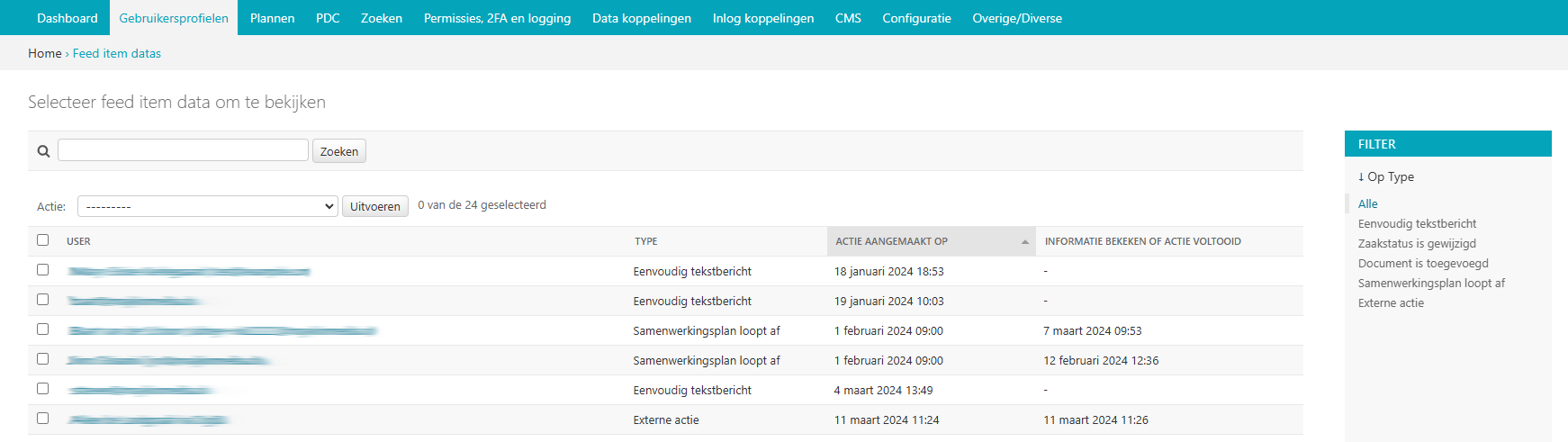 In de backend is het overzicht van de feed item data te raadplegen. Er is informatie te vinden over voor welke betreffende gebruiker de feed item data is, het soort feed item data, de datum waarop de actie is aangemaakt en of de informatie in de feed bekeken is of dat de actie is voltooid en zo ja, op welke datum. De gegevens kunnen worden gefilterd en gesorteerd op de al deze elementen.