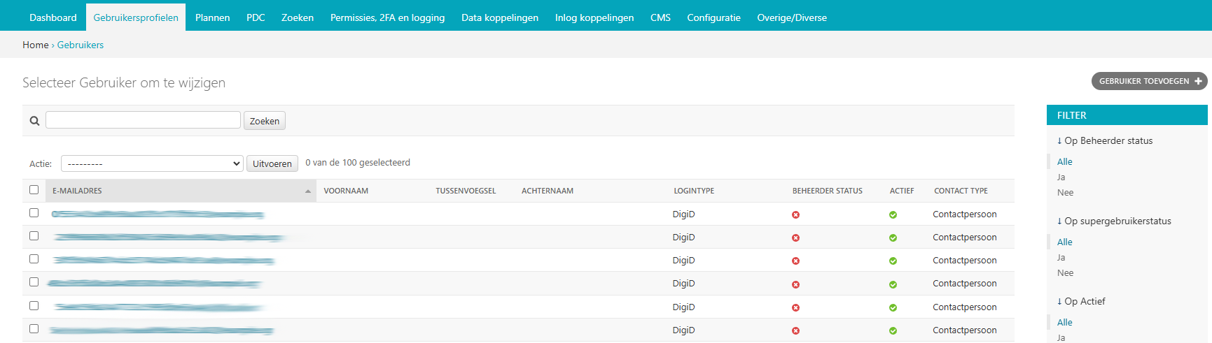 Onder gebruikers vindt u alle gebruikers van uw Open Inwoner. Indien gewenst kunt u gebruikers toevoegen, wijzigen en verwijderen. Daarnaast kunt u de permissies van gebruikers wijzigen en een gebruikersaccount overnemen (kapen). Bovendien kunt u de gebruikers eenvoudig filteren op beheerstatus, supergebruikerstatus of op activiteit.