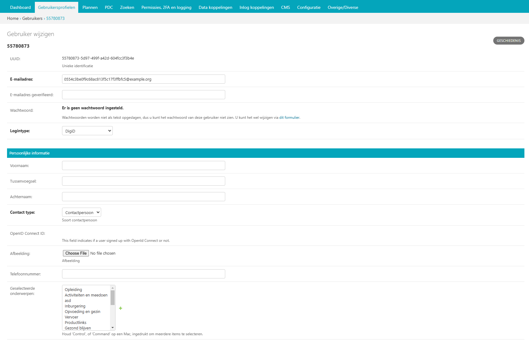 Door op een gebruiker in het overzicht te klikken, kunt u deze wijzigen. Er wordt een nieuw scherm geopend waar u naast de persoonlijke gegevens diverse wijzigingen kunt aanbrengen.