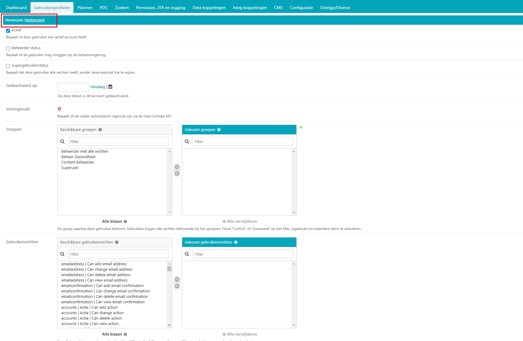 Door in het gebruikersoverzicht op een bepaalde gebruiker te klikken kunt u deze wijzigen, zoals in 4.6.3 beschreven. Wanneer u de permissies van een gebruiker wilt aanpassen, klikt u in het wijzigingsscherm in de blauwe balk met Permissies op [tonen]. U kunt nu de diverse wijzigingen rond de permissies aanbrengen.