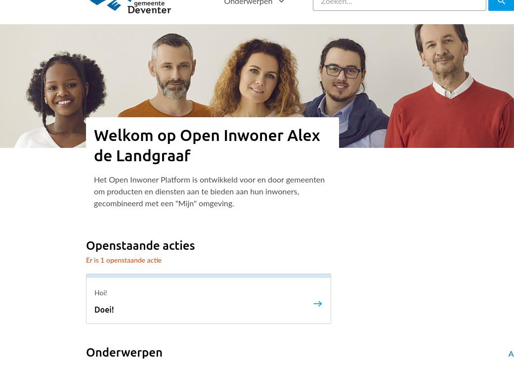 Onder feed item data kunt u zien welke openstaande acties er op de homepage van gebruikers zichtbaar zijn, zoals op het onderstaande screenshot te zien is. Gebruikers zien, na inloggen, welke openstaande acties zij nog hebben. Deze worden weergegeven in een blokje met daarin de titel van de actie en de omschrijving van de actie.