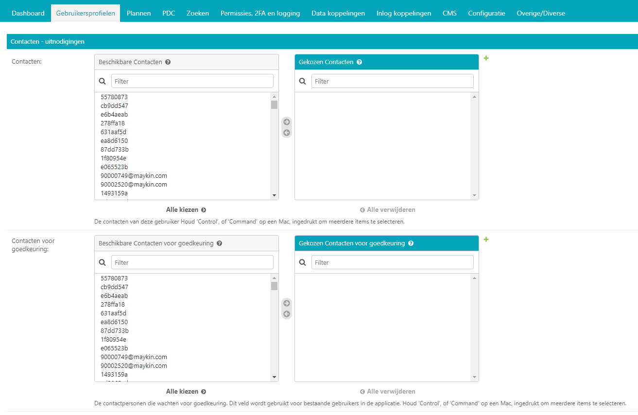 Onder contacten – uitnodigingen kunnen beheerders contactpersonen toevoegen aan gebruikers. In het linker veld staan de beschikbare contacten. Selecteer een contactpersoon of typ een gedeelte van een naam om de beschikbare contactpersonen te zien. Klik op het pijltje naar rechts om de contactpersoon toe te voegen aan de gebruiker. Om meerdere contactpersonen tegelijk te selecteren houdt u [ctrl] of de [command] knop ingedrukt. Wanneer de gebruiker in zijn profiel zelf contactpersonen toevoegt zijn deze hier ook aan de rechterzijde zichtbaar. De toegevoegde contactpersoon komt in eerste instantie rechts bij ‘beschikbare contacten ter goedkeuring’ te staan. Na wederzijdse goedkeuring door het toegevoegde contact wordt de contactpersoon weergegeven aan de rechterzijde van het veld ‘beschikbare contacten’.