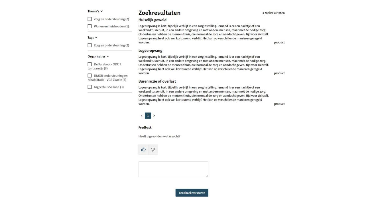 Gebruikers kunnen na het uitvoeren van een zoekopdracht feedback geven of ze met deze zoekresultaten geholpen zijn etc. Het feedbackformulier staat onder de lijst met zoekresultaten. Men kan een duimpje omhoog of omlaag geven en er is een tekstveld waarin opmerkingen kunnen worden geplaatst. In de onderstaande schermafbeelding ziet u het scherm met zoekresultaten en het feedbackformulier, zoals de gebruikers te zien krijgen. In het overzicht met feedback kunt u eenvoudig raadplegen of de gegeven feedback positief of negatief is. Dit wordt weergegeven met een groen vinkje (positief) of een rood kruisje (negatief). Ook kunt u zien wanneer de feedback is gegeven en op welke zoekterm.