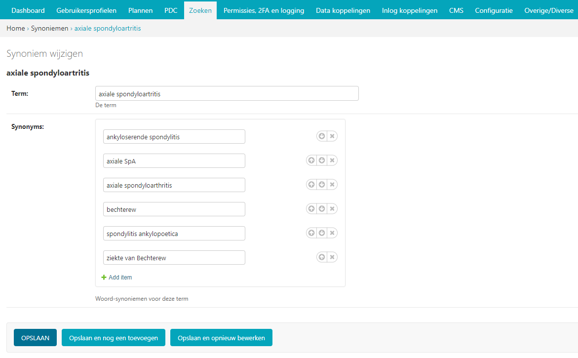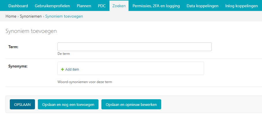 Door op de knop [synoniem toevoegen +] rechts bovenin uw scherm te klikken kunt u een nieuwe synoniem toevoegen. Er wordt een nieuw scherm geopend waar u de term en de bijbehorende synoniemen kunt invullen. Door op [extra synoniem toevoegen] te klikken kunt u nog een synoniem aan dezelfde term toevoegen. Om wijzigingen op te slaan klikt u op de knop [opslaan].