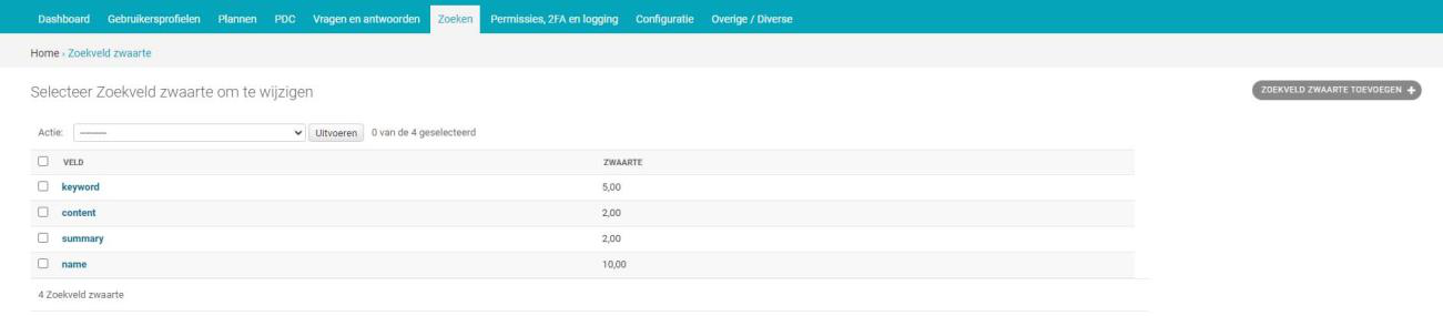 Bij zoekveldgewicht kunt u bepaalde velden meer gewicht meegeven. Dit betekent dat als een zoekwoord in een van deze elementen voorkomt hij hoger in de lijst met zoekresultaten wordt weergegeven. U kunt het zoekveldgewicht aanpassen en u kunt extra velden met zoekveldgewicht toevoegen.