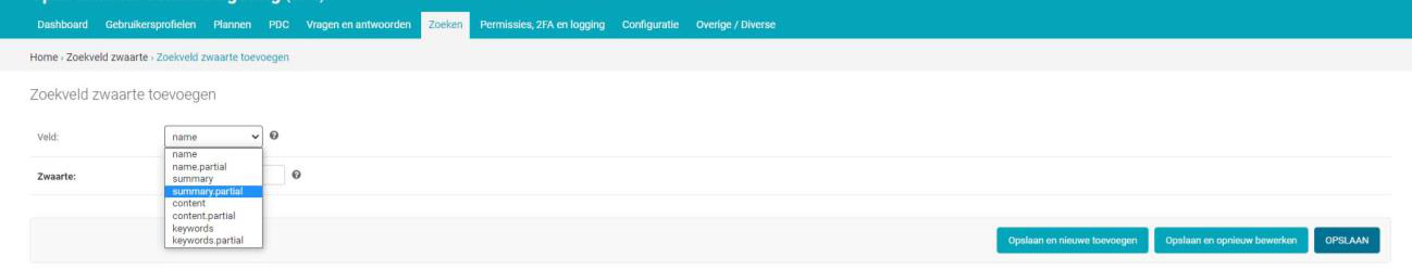 Naast de mogelijkheid om bij een match met een gehele zoekterm extra gewicht mee te geven, kunt u er ook voor kiezen extra gewicht mee te geven bij een match met slechts een gedeelte van een zoekterm/samenvatting/content/naam. Dit doet u door in het dropdown menu bij ‘veld’ te kiezen voor een van de opties met daarachter .partial. Bijvoorbeeld als de naam van een product “logeeropvang” is, dan geldt een ingesteld zoekveldgewicht zonder .partial enkel als er op de volledige zoekterm (logeeropvang) wordt gezocht. Bij het gebruik van .partial kan een bepaald (lager/hoger) gewicht gegeven worden aan een deel van de productnaam. Bijvoorbeeld wanneer gezocht wordt op “opvang” geldt het .partial gewicht. Om wijzigingen op te slaan klikt u op de knop [opslaan].