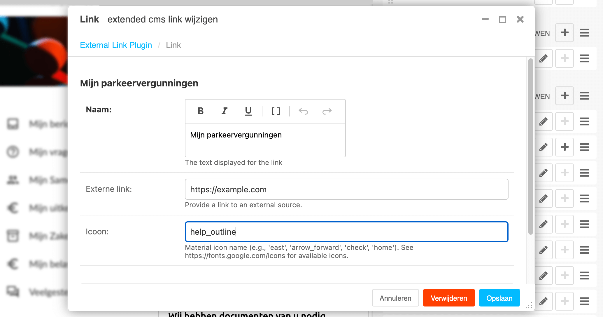 De exacte code-naam van het icoon verschijnt in de rechter pop-up. Vul deze naam in het veld ‘Icoon’ in, inclusief eventuele underscores (bijvoorbeeld help_outline of account_balance).