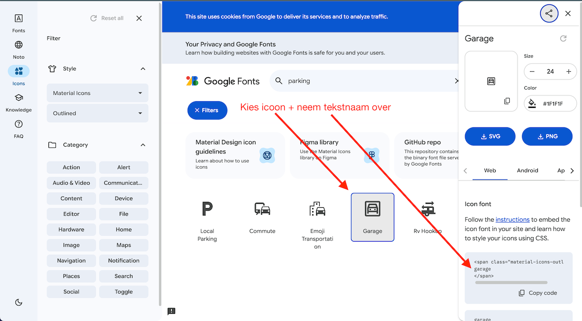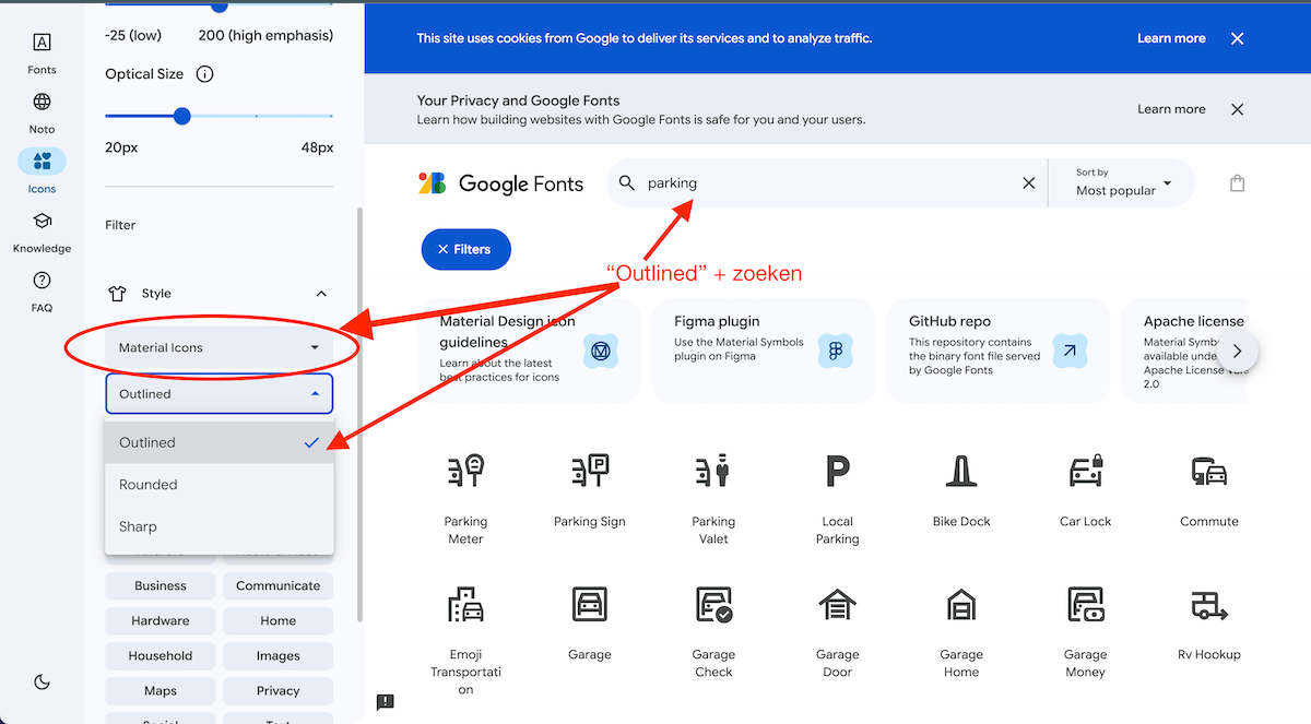Kies in de linkerbalk de subset ‘Material Icons’ (niet ‘Material Symbols’) en selecteer vervolgens de variant ‘Outlined’. In het middendeel kunt u gericht zoeken op soorten iconen, bijvoorbeeld ‘park’ of ‘help’.