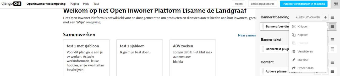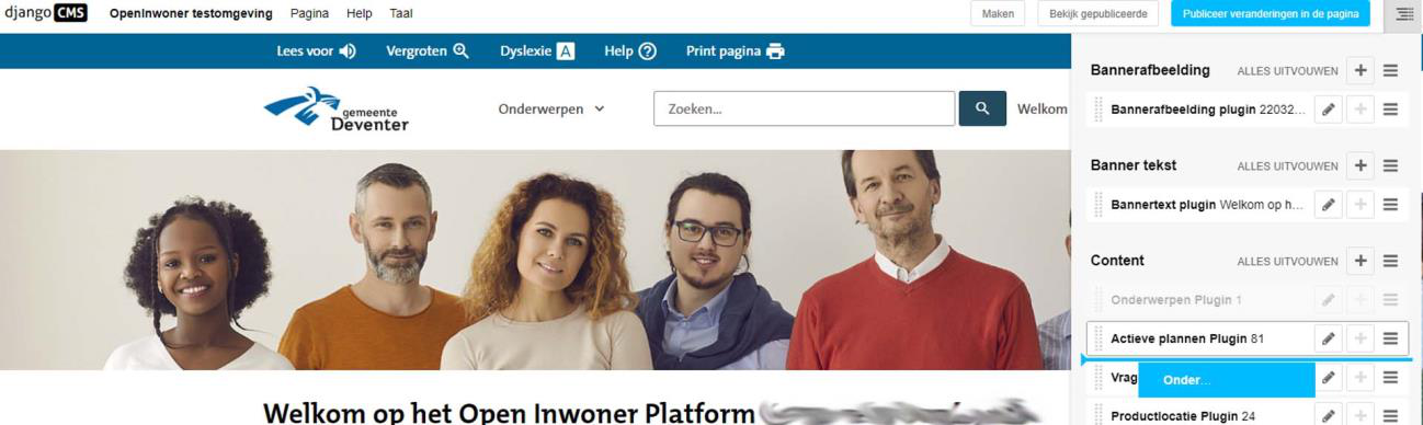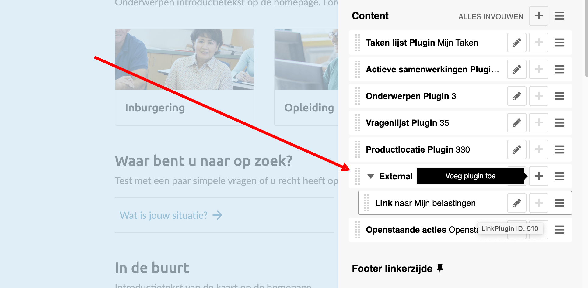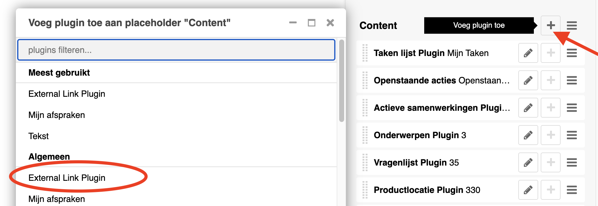 Voeg eerst de plugin toe aan de pagina door middel van het plus symbool. Sleep deze plugin naar de gewenste volgorde binnen de plugin hiërarchie.