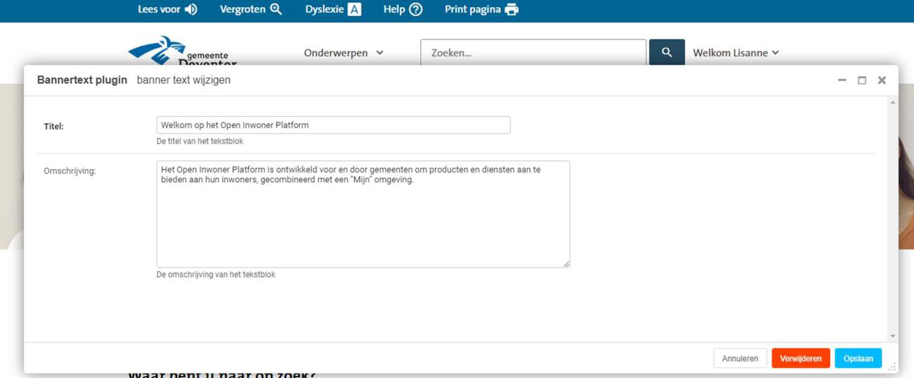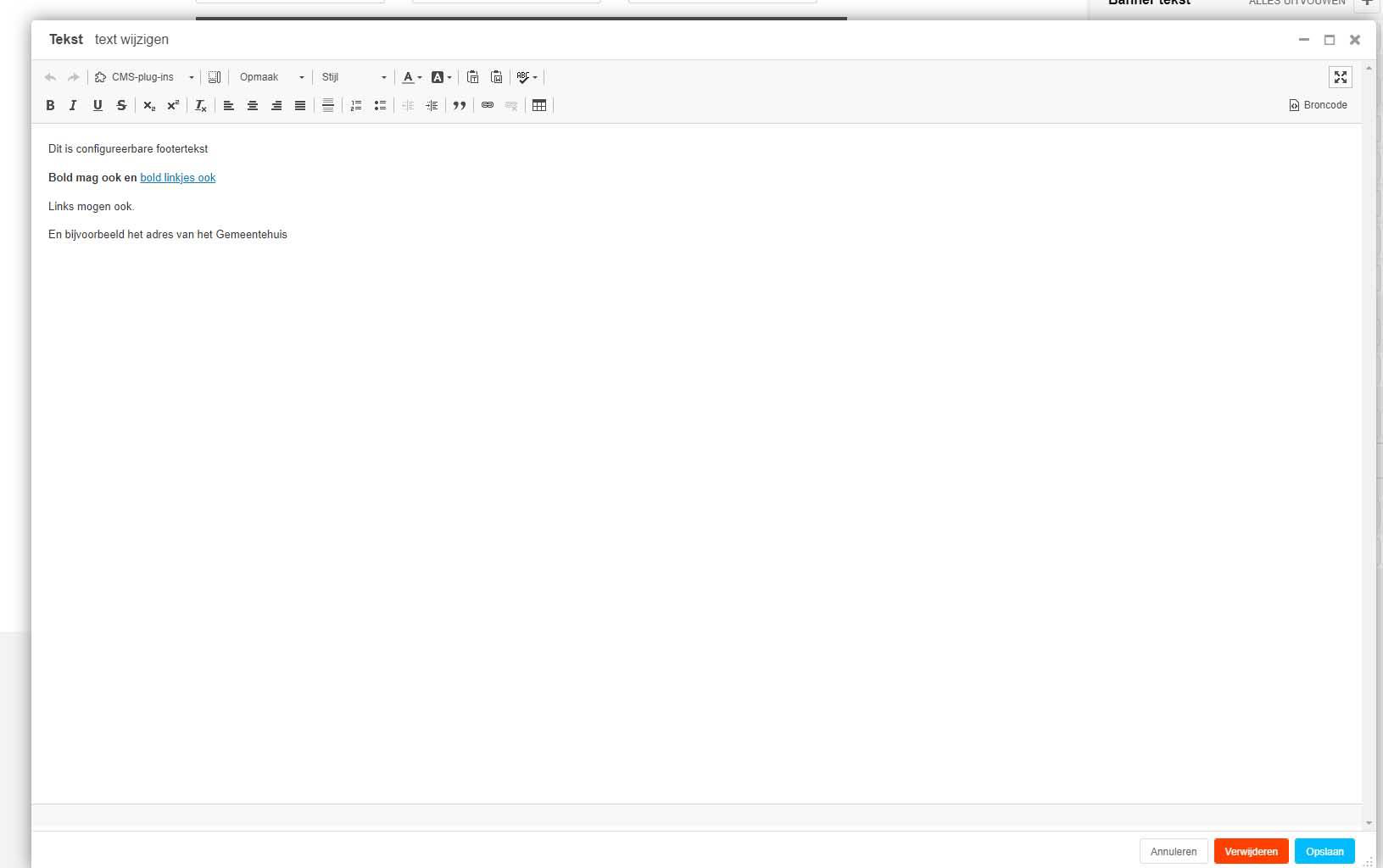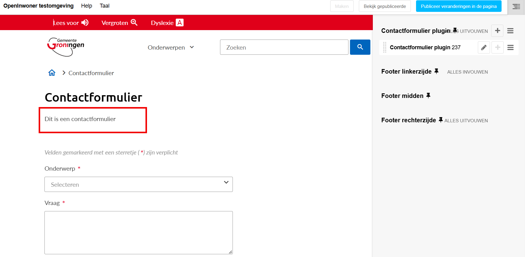 Wanneer u op het potloodicoontje klikt, verschijnt er een pop-up waarmee u de begeleidende teksten van het contactformulier kunt aanpassen middels een rich text editor. Zodra u uw gewenste teksten heeft opgesteld klikt u op opslaan en “Publiceer veranderignen in de pagina.” De tekst wordt direct boven het contactformulier weergegeven.