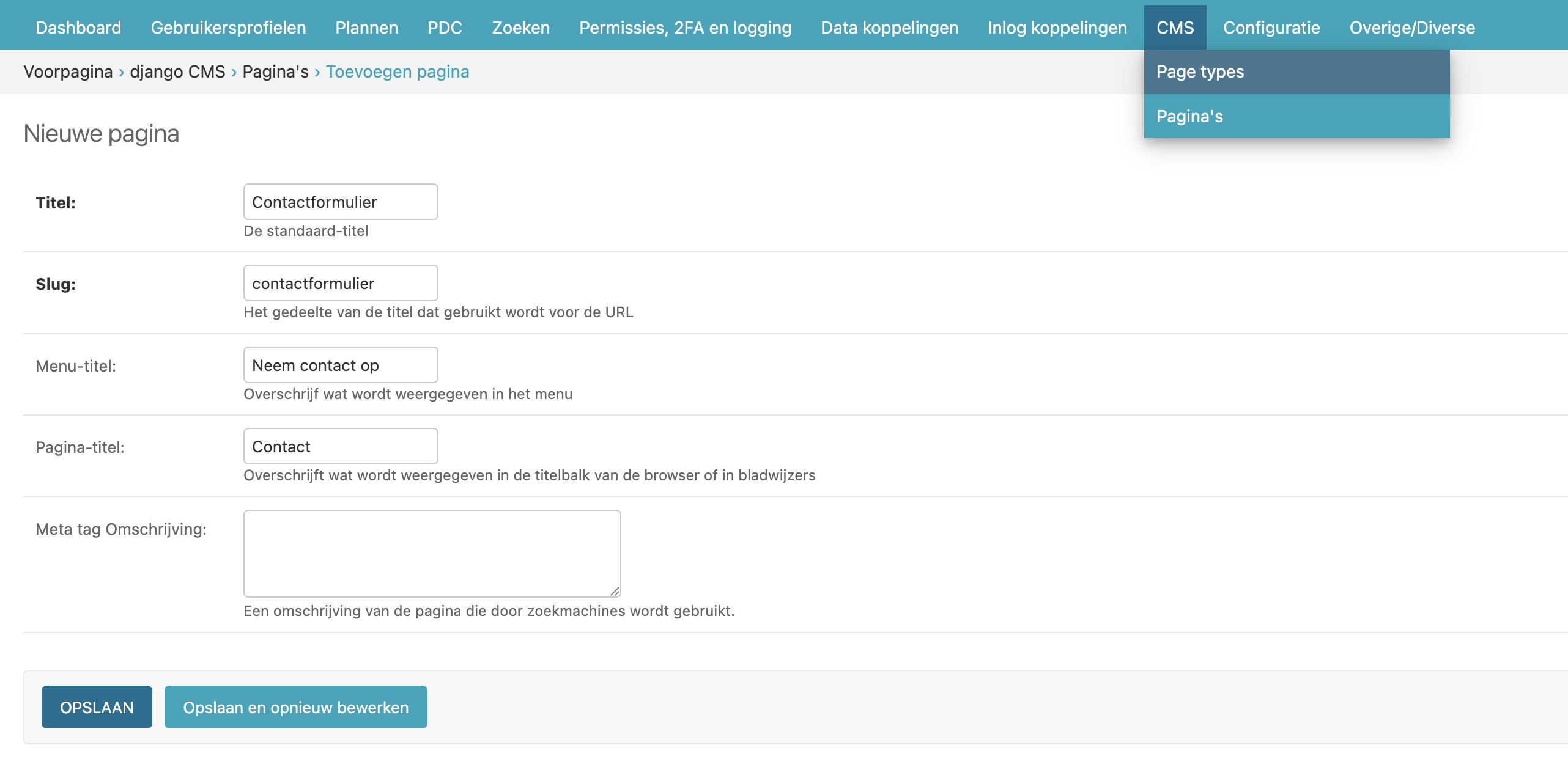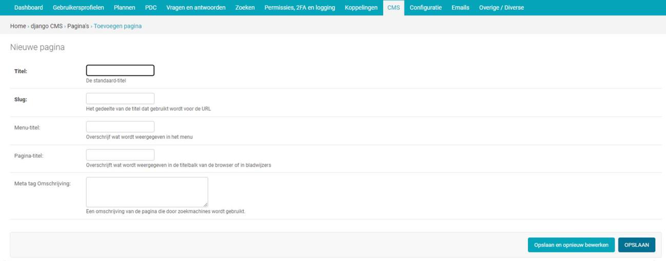 Wanneer u nieuwe pagina’s wilt toevoegen klikt u op de blauwe button met [Nieuwe pagina]. U maakt dan een nieuwe pagina op hoofdniveau aan. U komt in een nieuw scherm waarin u de gegevens van de nieuwe pagina moet invullen. Wanneer alle gegevens zijn ingevuld klikt u op [Opslaan]. U keert hierna terug naar het paginaoverzicht. Wilt u een nieuwe subpagina aanmaken? Dan klikt u op [+] achter de betreffende hoofdpagina. U komt vervolgens op een nieuw scherm waarin u de gegevens van de nieuwe subpagina moet invullen. Dit zijn dezelfde gegevens als bij een nieuwe hoofdpagina. Wanneer alle gegevens zijn ingevuld klikt u op [Opslaan].