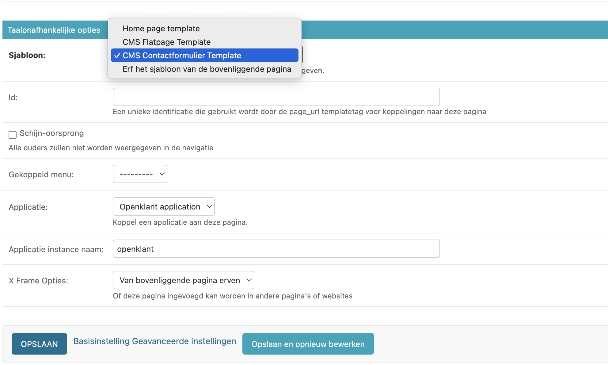Na bewaren kunt u voor deze contactpagina naar “Geavanceerde instellingen” gaan en daar eerst het juiste sjabloon kiezen (“CMS Contactformulier Sjabloon”) en de juiste Applicatie koppelen: “Openklant applicatie.” Publiceer de pagina. Deze wordt direct zichtbaar als link in de footer en in de sitemap.