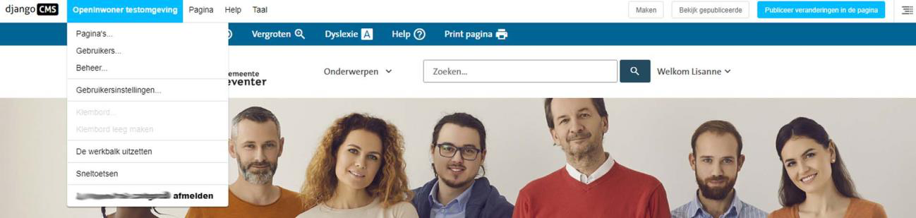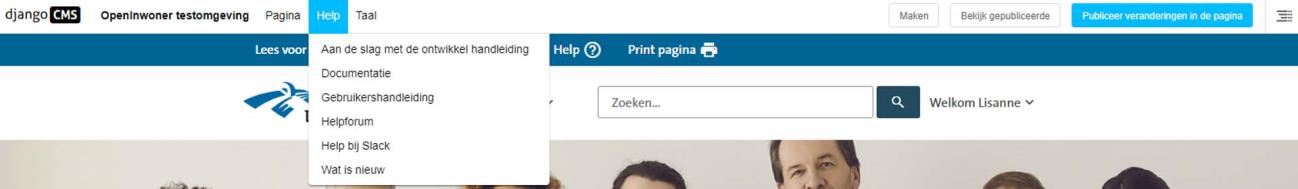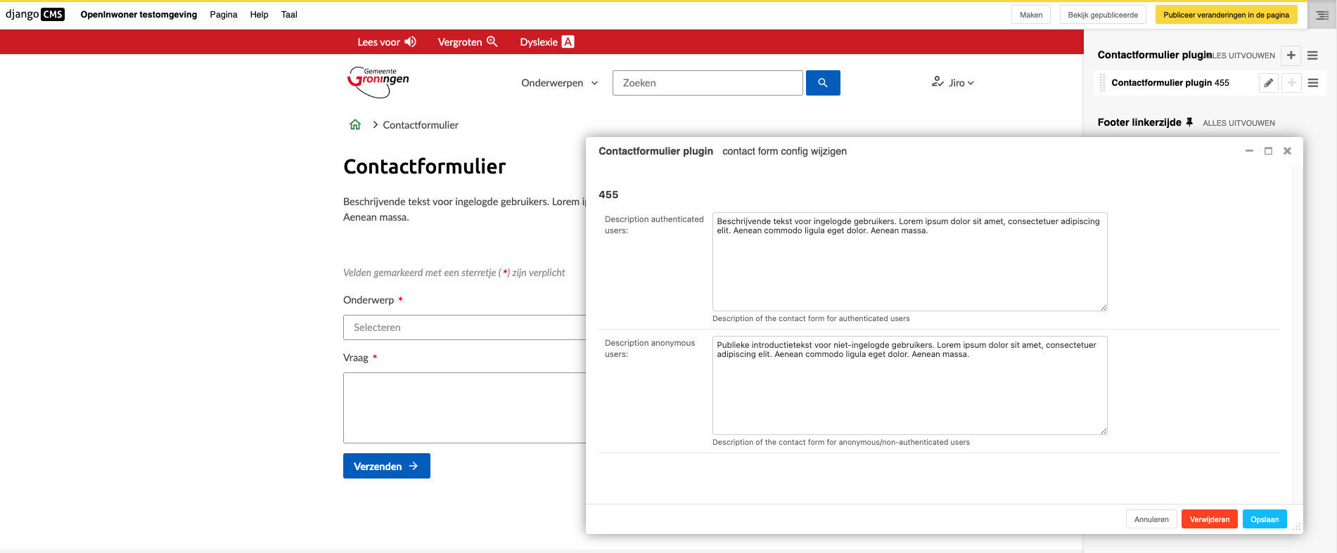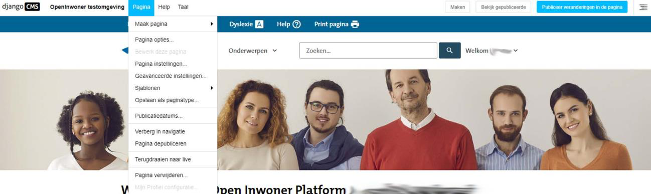 Django CMS kan worden bereikt via het CMS menu. U krijgt dan in de front-end van het Open Inwoner Platform de opties om nieuwe pagina’s aan te maken of te wijzigen. Indien u dit nog niet gedaan heeft, dan kunt u hier een pagina aanmaken voor het contactformulier en deze eerst opslaan.