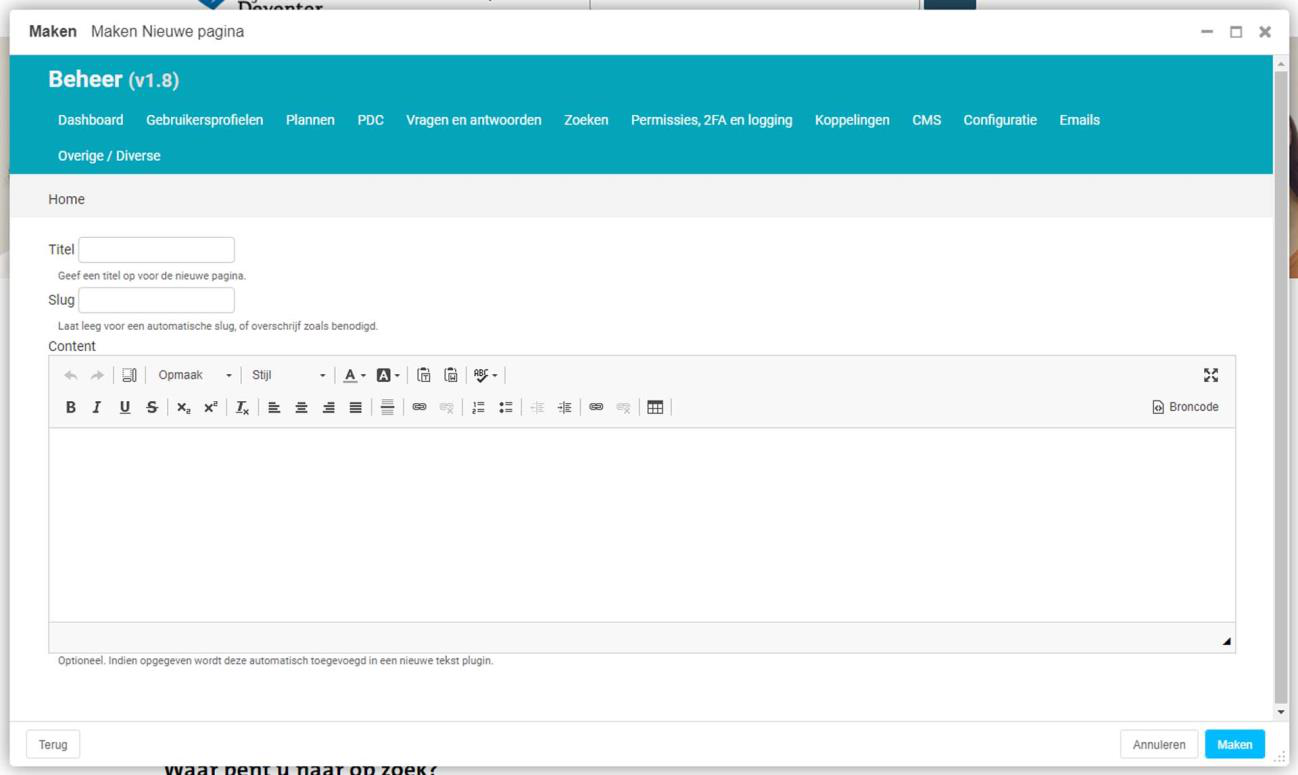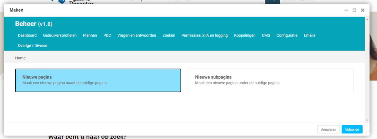 U kunt eenvoudig en snel een nieuwe pagina aanmaken wanneer u op de knop [Maken] klikt. Afhankelijk van op welke pagina u zich bevindt krijgt u de mogelijkheid een nieuwe pagina of subpagina te maken. Maak een keuze en klik op [Volgende].