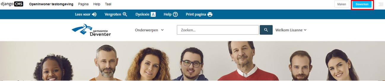 U kunt eenvoudig een pagina bewerken wanneer u op de knop [Bewerken] klikt. Let op! Deze knop is alleen zichtbaar als u op de live versie (gepubliceerde pagina) bent. Bevindt u zich op een pagina waar al zaken gewijzigd zijn, dan ziet u hier de knop [Bekijk gepubliceerde pagina].