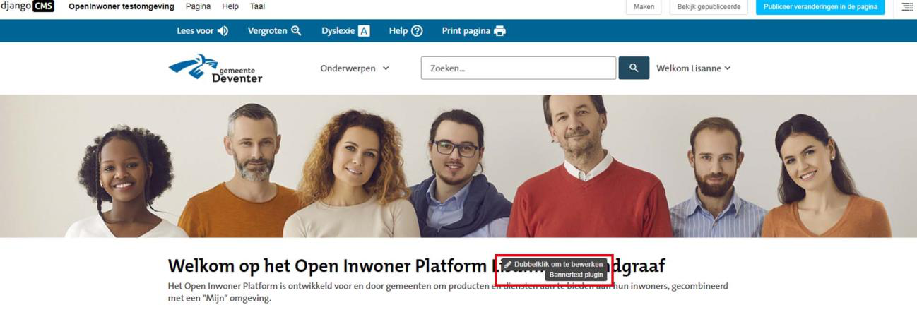 Wanneer u op de knop [Bewerken] heeft geklikt krijgt u de mogelijkheid dingen aan te passen. Wanneer u met de muis over de elementen op de pagina hoovert kunt u zien wat u kunt aanpassen. Er verschijnt een pop-up die zegt dat u kunt dubbelklikken om te bewerken. Onder deze tekst staat wát u kunt aanpassen (welk element).