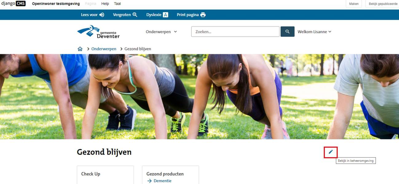 U kunt eenvoudig een onderwerp wijzigen door op de onderwerp-pagina op het potloodicoontje te klikken. Als u hierover hoovert ziet u staat ‘Bekijk in beheeromgeving’. Wanneer u op het potloodicoontje klikt, opent in een nieuw venster de backend van het betreffende onderwerp. Hier kunt u alles wijzigen rond dit onderwerp. Zie meer hierover in hoofdstuk 6.9.