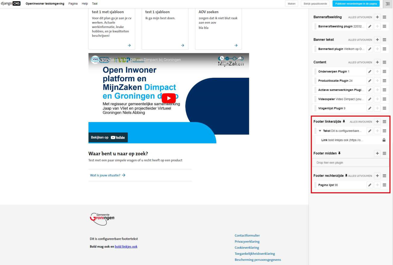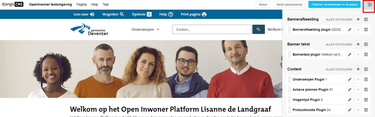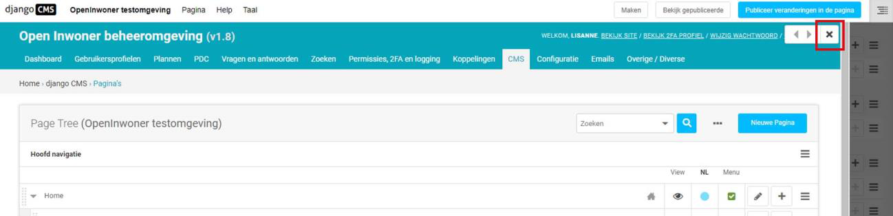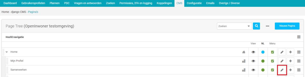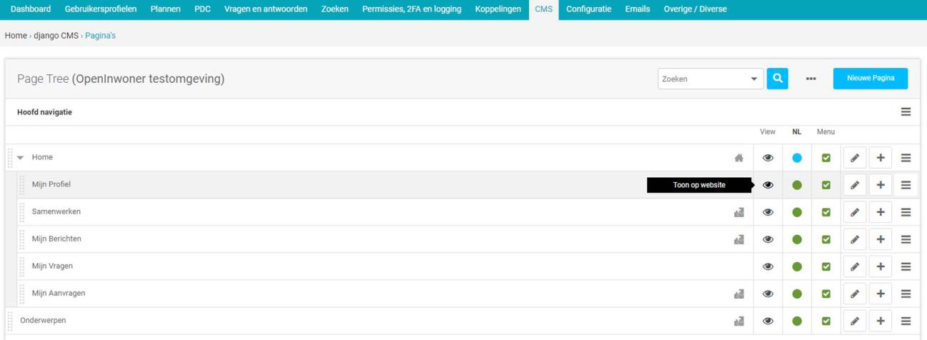 Het CMS maakt het mogelijk aan de voorkant van Open Inwoner direct bepaalde wijzigingen door te voeren. Op deze manier hoeft u voor sommige wijzigingen niet meer eerst naar de configuratie in de backend te gaan. Om frontend wijzigingen te maken gaat u eerst in de backend naar het onderdeel ‘pagina’s’ onder het menu-item CMS en klikt u op het oogje achter de pagina die u wilt wijzigen, zie hoofdstuk 11.1.6.