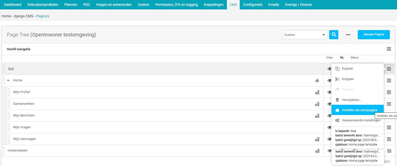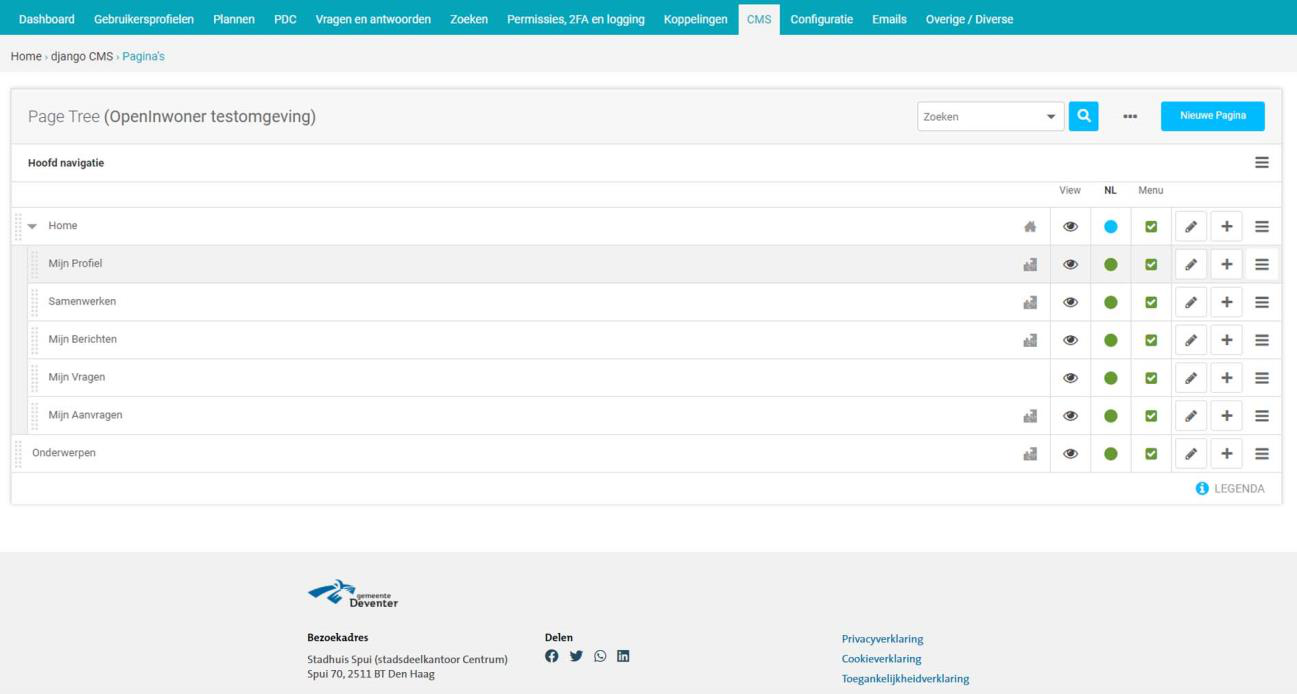 Onder CMS vindt u alle dingen die u middels het CMS kunt aanpassen. Bij Page types kunt u het soort pagina definiëren en onder Pagina’s kunt u de menustructuur van uw Open Inwoner aanpassen. Het gaat hier om de pagina’s die worden weergegeven in het uitklapmenu op de homepage. Middels het CMS kunt u eenvoudig pagina’s aan- en uitzetten en verplaatsen. Tevens kunt u als beheerder door het CMS nu wijzigingen aan de voorkant van Open Inwoner doorvoeren zonder dat u hiervoor in de backend naar de configuratie hoeft te gaan.