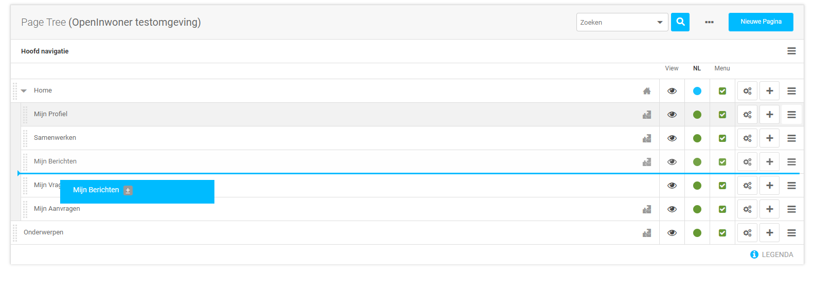 Wanneer u onder de kolom ‘NL’ op het gekleurde bolletje klikt, kunt u de status van de gekozen pagina wijzigen. Een groen bolletje betekent dat de pagina gepubliceerd is. Een blauw bolletje geeft aan dat er niet opgeslagen wijzigingen op een pagina zijn en een grijs bolletje betekent dat de pagina nog niet of niet meer gepubliceerd is en dus niet aan de voorkant van de site wordt weergegeven. Bezoekers kunnen deze pagina dus níet bereiken als het bolletje grijs is.