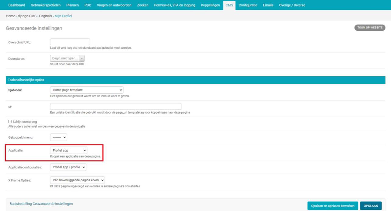 Wanneer u dubbelklikt op het grijze icoontje met puzzelstukjes achter een menu item kunt u de gekoppelde applicatie wijzigen. Door te dubbelklikken komt u in het scherm met geavanceerde instellingen, waar bij “Applicatie” de gekoppelde applicatie kan worden aangepast. Zie het rode kader in het onderstaande screenshot. Klik na het wijzigen op [Opslaan] om de wijzigingen door te voeren.