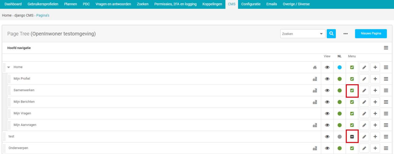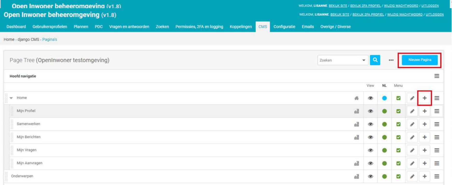 Bij Pagina’s ziet u de boomstructuur van het menu van Open Inwoner. In het screenshot rood omkaderd.