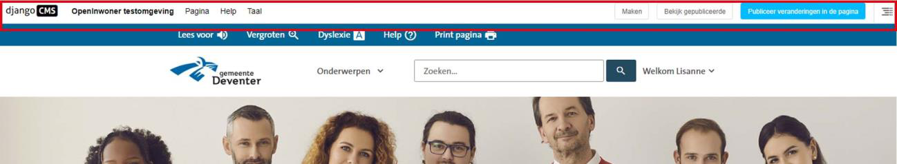 In het nieuw geopende scherm ziet u nu bovenin beeld een balk met frontend navigatie voor het CMS. Op deze manier kunt u via de voorkant van de website/pagina dingen aanpassen zonder dat u eerst weer terug hoeft te gaan naar de beheeromgeving.