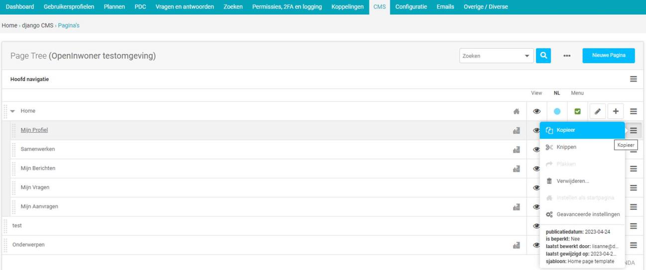 Wanneer u een pagina wilt dupliceren klikt u op het hamburgermenu achter de betreffende pagina op [kopiëren] te klikken. Wanneer niets gekopieerd is, is de knop [plakken] grijs. Wanneer u echter een pagina gekopieerd heeft krijgt u wel de mogelijkheid te plakken. De gekopieerde pagina wordt geplakt op de geselecteerde locatie, maar kan vervolgens eenvoudig op de bij hoofdstuk 11.1.1 beschreven methode worden versleept.