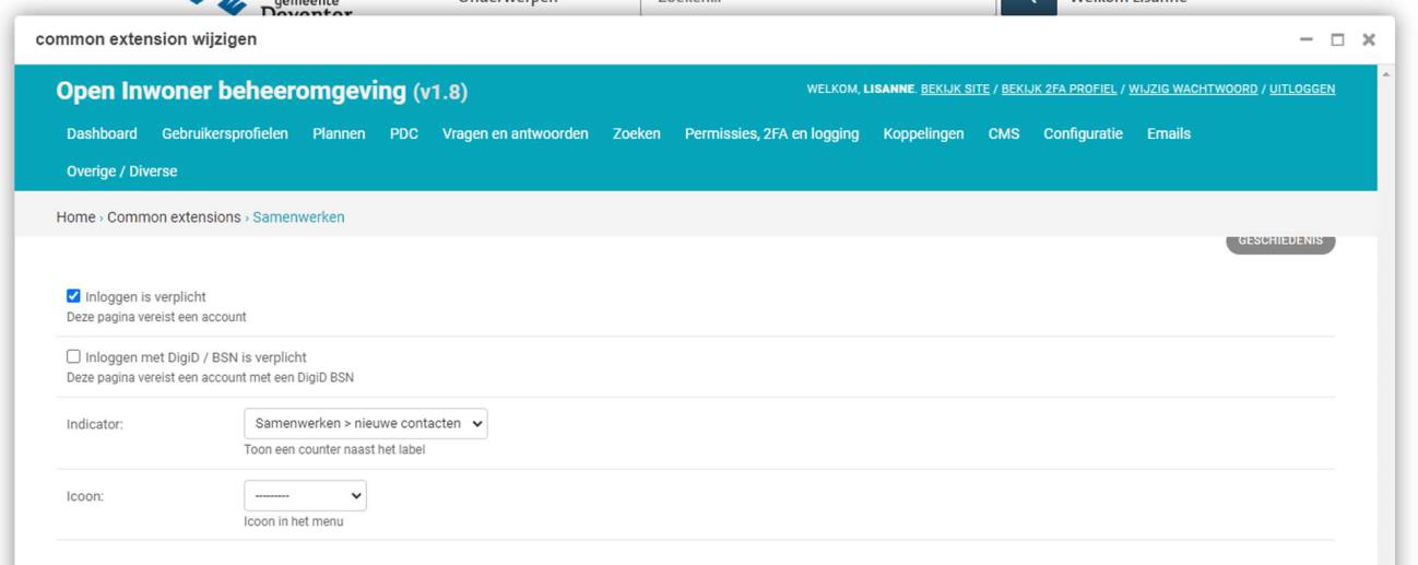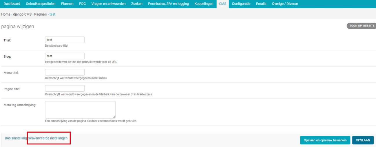 U kunt echter ook op de button [Geavanceerde instellingen] klikken, waarna u de geavanceerde instellingen kunt wijzigen. U komt dan op een ander scherm terecht waar u aanvullende gegevens kunt wijzigen. Na het wijzigen klikt u op [Opslaan]. U kunt dit scherm ook direct bereiken door in het hamburgermenu achter de betreffende pagina op [Geavanceerde instellingen] te klikken.
