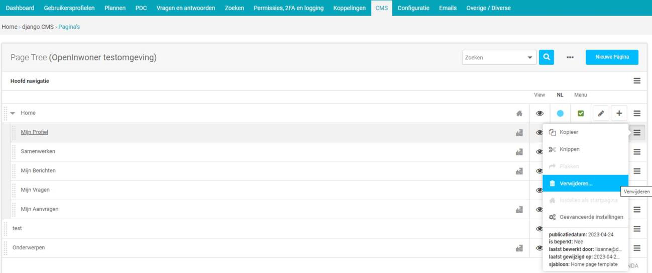 Om een pagina helemaal te verwijderen klikt u op het hamburgermenu (de drie streepjes) achter de betreffende pagina. Er verschijnt nu een pop-up met diverse opties, waaronder [Verwijderen]. Wanneer u hierop klikt verwijdert u de gehele pagina. U haalt hiermee dus alles weg en verwijdert niet enkel de pagina uit het menu.